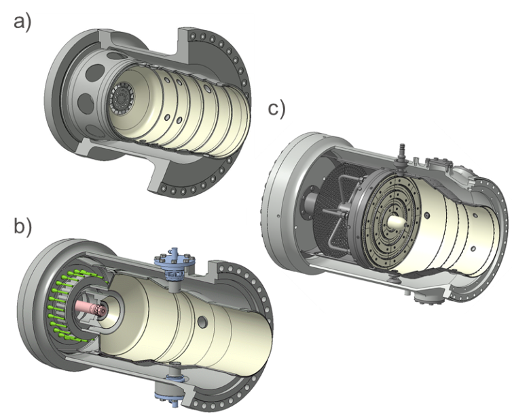 Kawasaki Heavy Industries, Ltd. (KHI) hat sich dieser Herausforderung angenommen und im letzten Jahrzehnt drei unterschiedliche Wasserstoff Verbrennungssysteme auf Basis des Gasturbinenaggregates GPB17 entwickelt und getestet, welche in Abbildung 1 zu sehen sind. Die Diffusions Brennkammer in Abbildung 1a) zeichnet sich durch ihre hochflexible Betriebsweise aus. Sie kann sowohl mit 100%igem Wasserstoff als auch mit 100%igem Erdgas betrieben werden. Zudem können beliebige Gasgemische aus Wasserstoff und Erdgas eingestellt werden. Um niedrige NOx Emissionen zu erreichen, wird zusätzlich Wasser in die Brennkammer eingedüst.