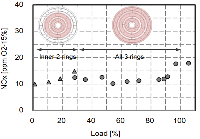 Abbildung 6 zeigt die Verteilung der NOx-Emissionen (15 Vol.%O2) in Abhängigkeit der thermischen Belastung. Der Brennkammerdruck beträgt 2 bar. Die drei Ringsegmente können in Abhängigkeit der benötigten thermischen Leistung separat angesteuert und befeuert werden. Bei bis zu 30% Last werden die zwei inneren Ringe verwendet. Ab 30% Last bis zur Volllast wird zusätzlich der dritte Ring gezündet.